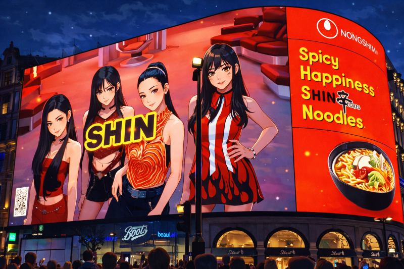 A notable example is Nongshim’s Shin Ramyun campaign at London’s Piccadilly Circus, where large-scale digital billboard advertising was combined with on-site promotional experiences.