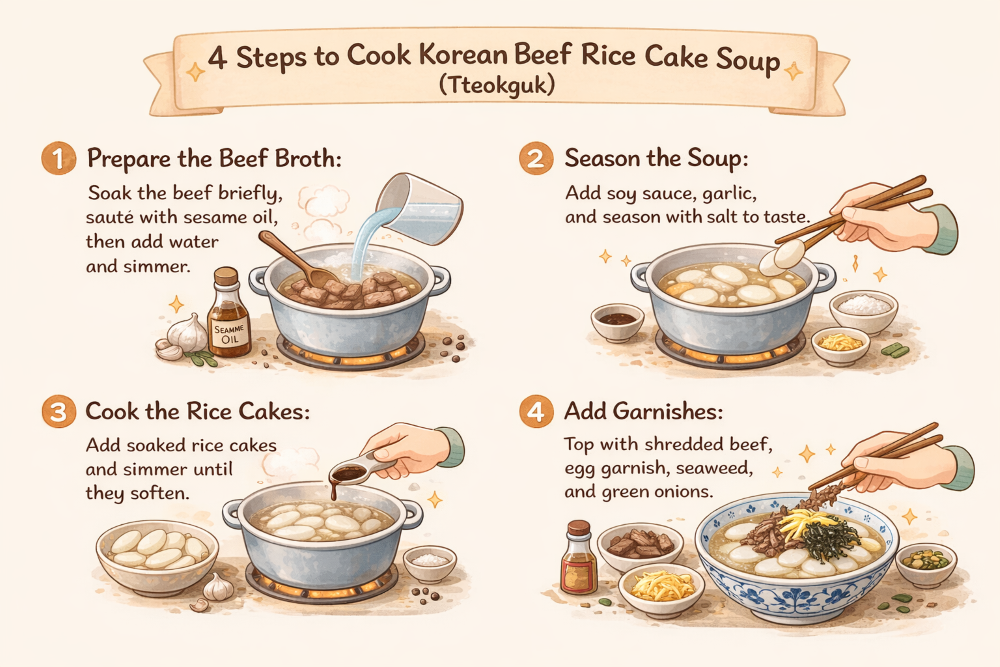 Learn how to make Korean rice cake soup (tteokguk) with a cute illustrated guide. Discover its traditional meaning and step-by-step recipe.